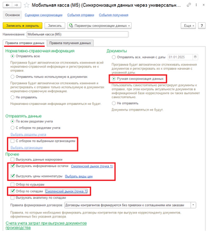 На первой вкладке для синхронизации документов выбираем Ручная синхронизация данных либо Отправлять все, начиная с даты. В общем случае из документов нам необходима установка цен. При настройки синхронизации в ручном режиме их придётся помечать к отправке вручную, при автоматическом — они будут помечаться автоматически.